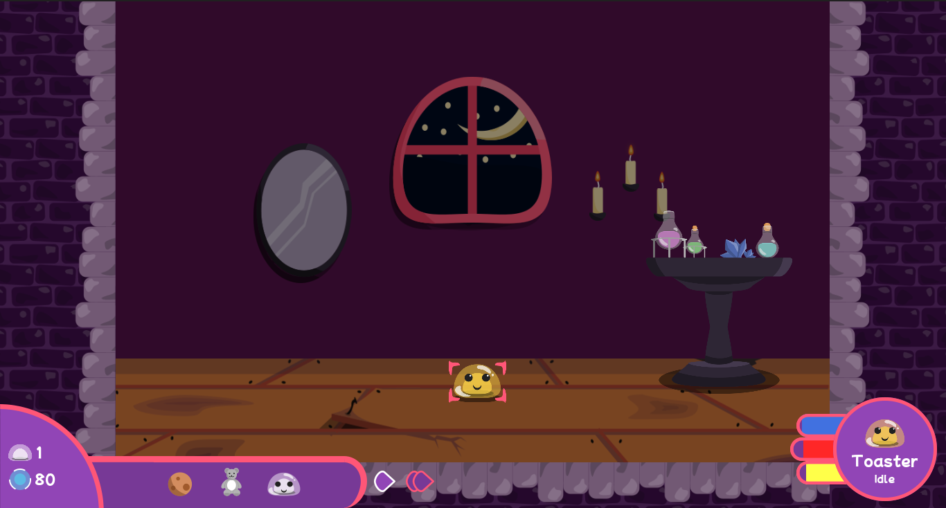 In Slime Witch, you take care of your pet slimes. Once a slime grows big enough, it'll split and become two smaller slimes. Each slime has "genes" which subtly control their color and behavior under the hood, each time a slime splits, they can mutate ever so slightly. Slimes of certain color will have special features.